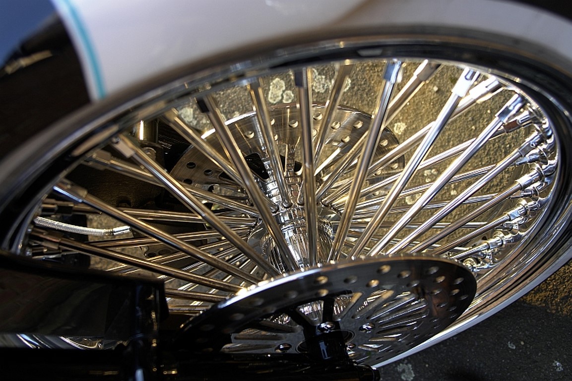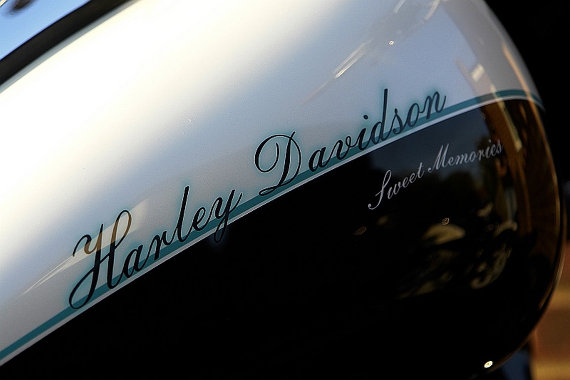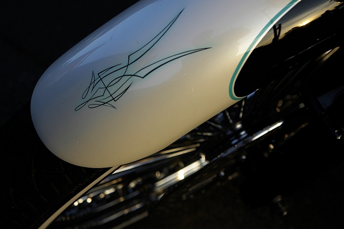Sweet Memories started its life as 2005 Road King and in 2011 it has been given complete rebuild, transforming it into low ride, californian style comfortable tourer. A cherry on the cake is a all my by hand paint job, which includes hand written lyrics of Bob Marley song 'Stir It Up'. In 2011 it has won HD Dealer WARRS prize in public voted competition at the Ace Cafe London for the best customized Harley bike.